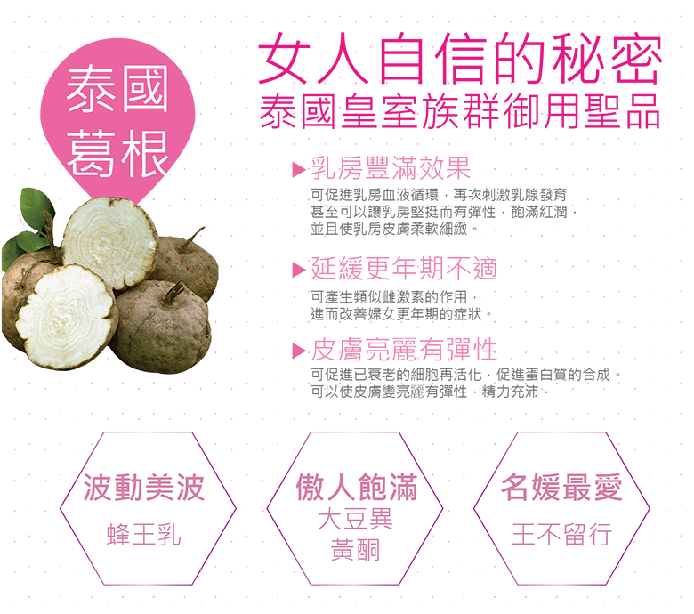 ◆成 份: 泰國葛根、蜂王乳、大豆抽出物(含異黃酮)、鹿茸、王不留行、紅花苜蓿、紅景天、當歸、淮山、植物性膠囊、水、二氧化鈦
